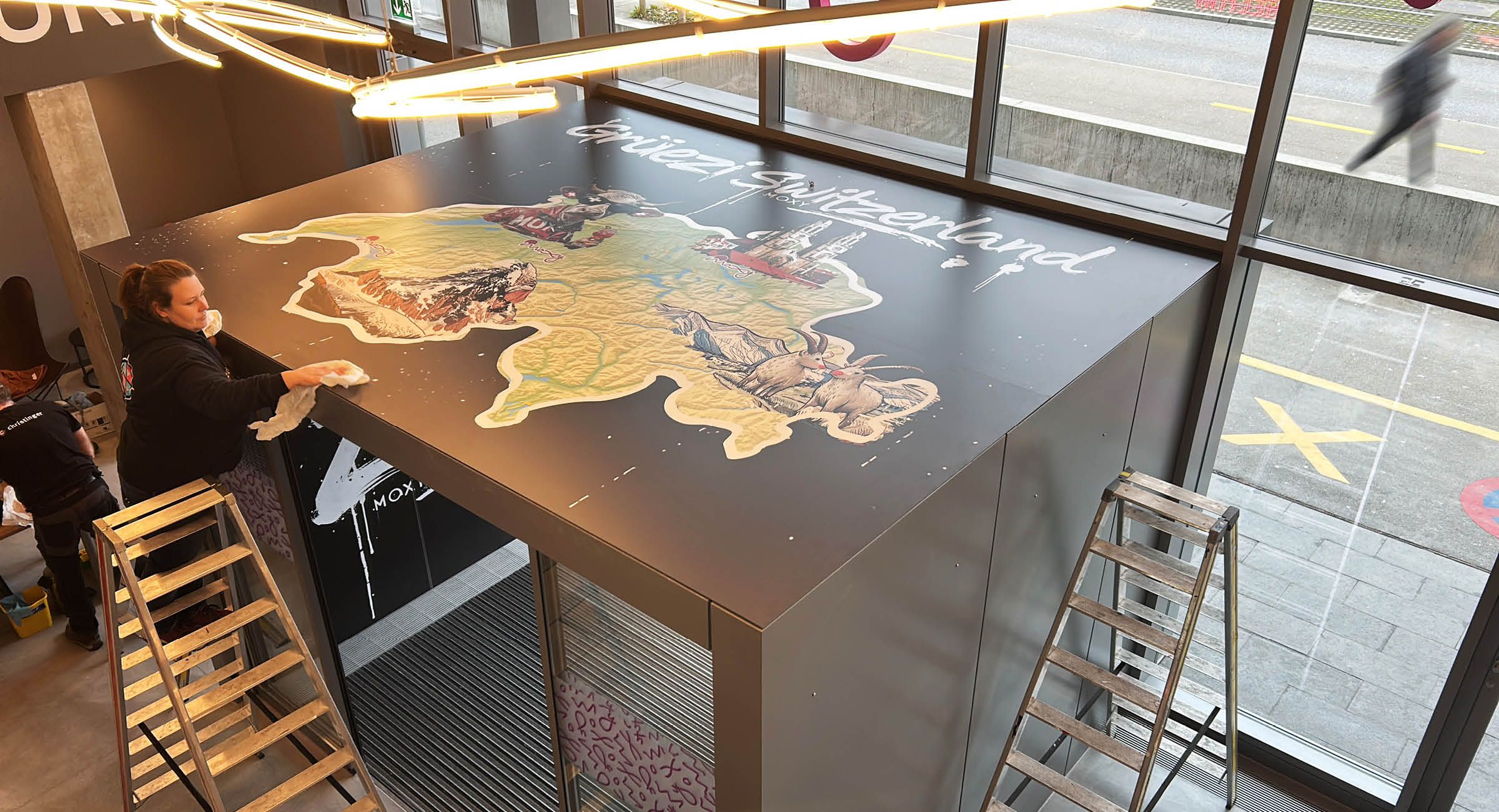 Christinger AG durfte in diesem spannenden Projekt beim Interior Design mit grossflächigen Bildern, Schriften und diversen Signaletikelementen passend unterstützen. Viele Elemente der dabei kreierten Bildwelten konnte unser Team mit Beizug von AI-Tools für die Kunden erschaffen. Faszinierend, mit welch grossartigen und kreativen Möglichkeiten die künstliche Intelligenz unseren Tätigkeitsbereich erweitert.